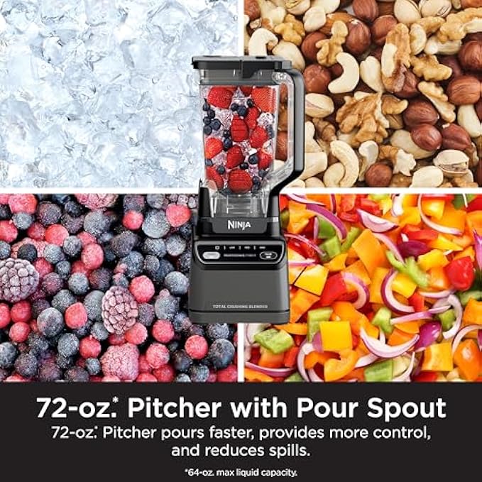 1200-WATT MOTOR BASE: Made for powering through the toughest ingredients. AUTO-IQ TECHNOLOGY: Take the guesswork out of blending with the Crush preset program that combines unique timed pulsing, blending, and pausing patterns that do the work for you. 72-OZ.* FULL-SIZE PITCHER: Great for making large batches for the whole family. (*64-oz. max liquid capacity) STACKED BLADE ASSEMBLY: The Ninja Total Crushing blades turn ice to snow for smoothies, shakes, frozen drinks, and more. MANUAL SPEED CONTROL: Low, medium, high, and pulse settings allow for complete control. RECIPE INSPIRATION: The included 10-recipe quick start guide provides inspiration for smoothies, sorbet, salsas, and dips. DISHWASHER SAFE: Containers, lids, and blades are all BPA free and top-rack dishwasher safe. WHAT’S INCLUDED: 1200-Watt Motor Base, 72-oz. Total Crushing Pitcher with Pour Spout, Stacked Blade Assembly, 10-Recipe Quick Start Guide.